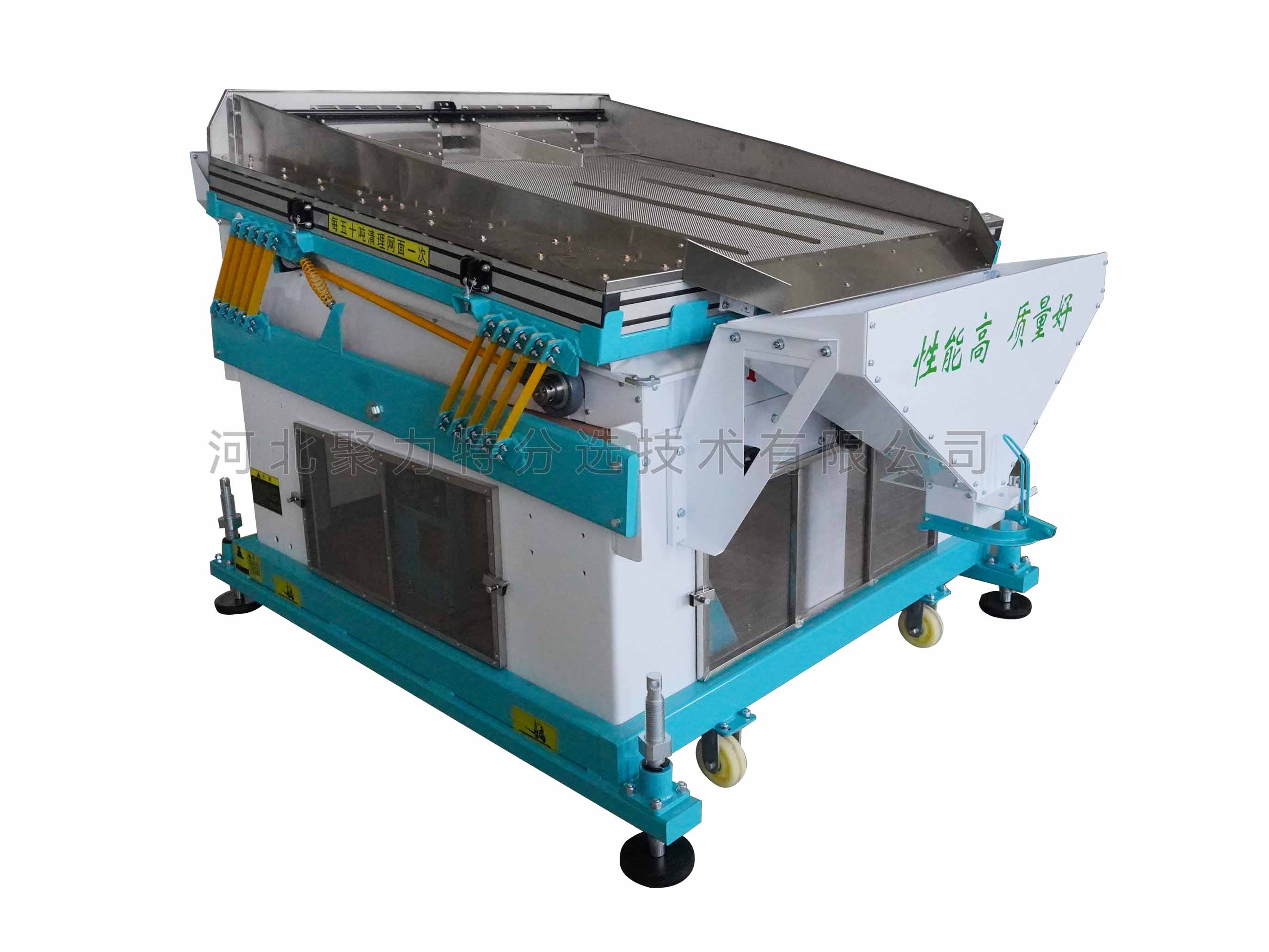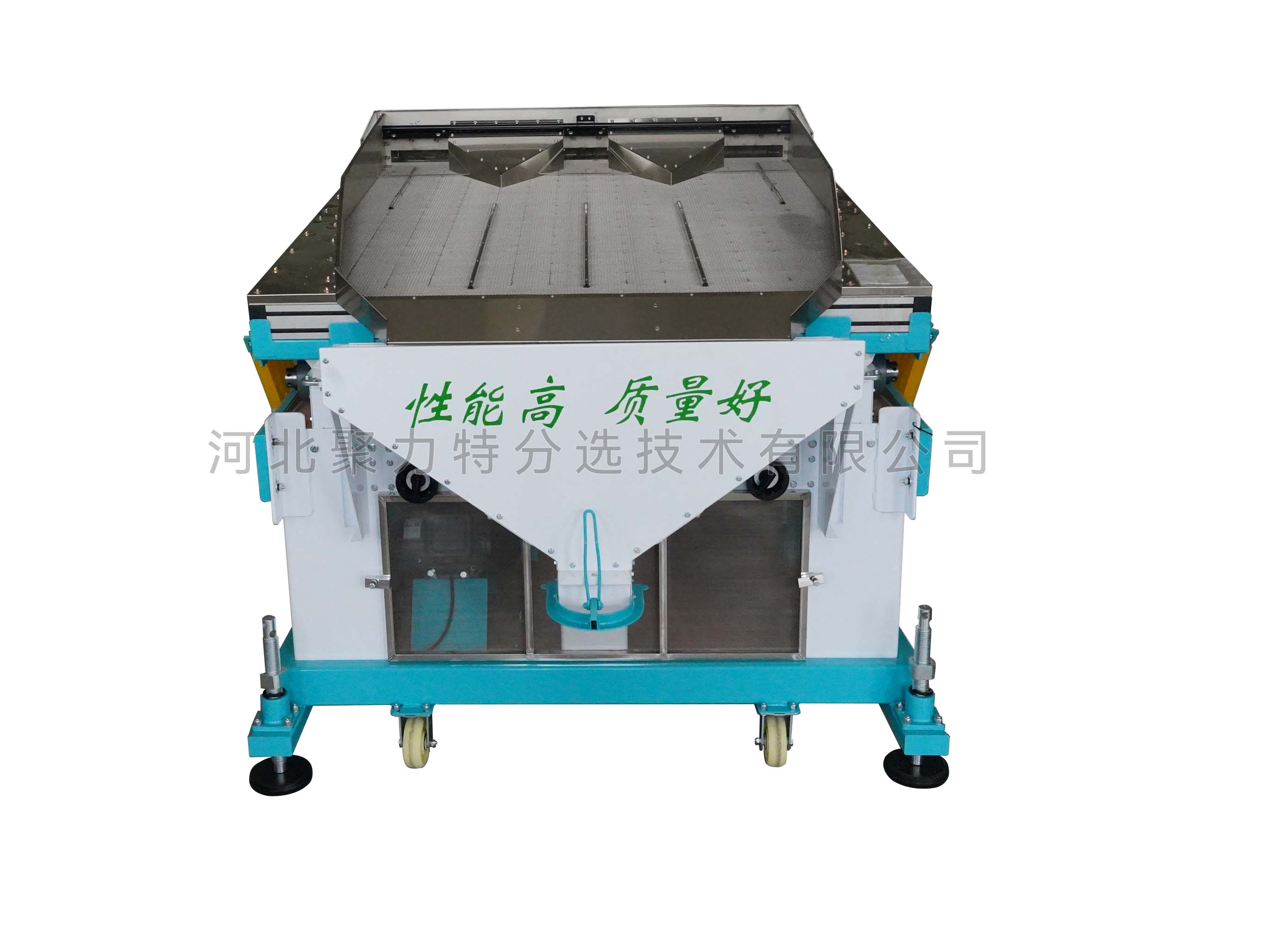 適用于單一目的物料的選別,能把物料中的并肩石(與物料粒度大小相似的砂石)等較重的雜質(zhì)有效去除。在糧食加工的工藝流程中應(yīng)安裝在篩選流程的后段工序,未經(jīng)去除大、小、輕雜質(zhì)的原料,不應(yīng)直接進(jìn)入該機(jī),以避免影響去石效果。