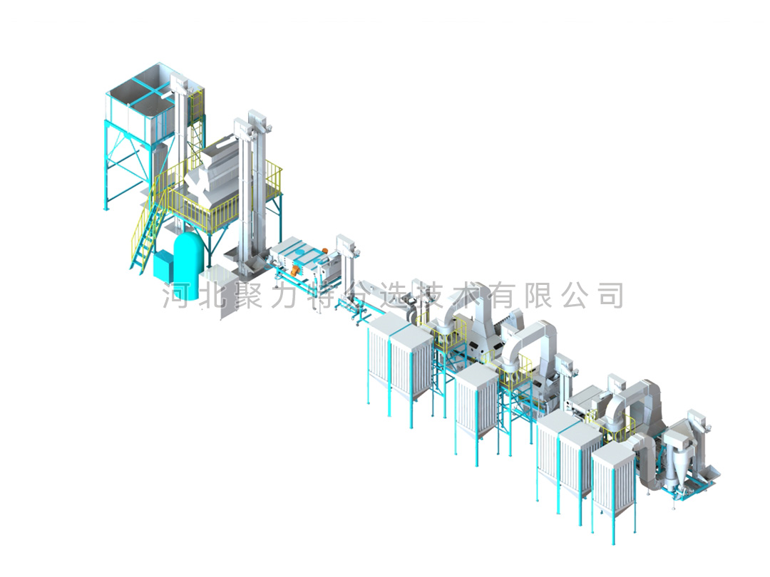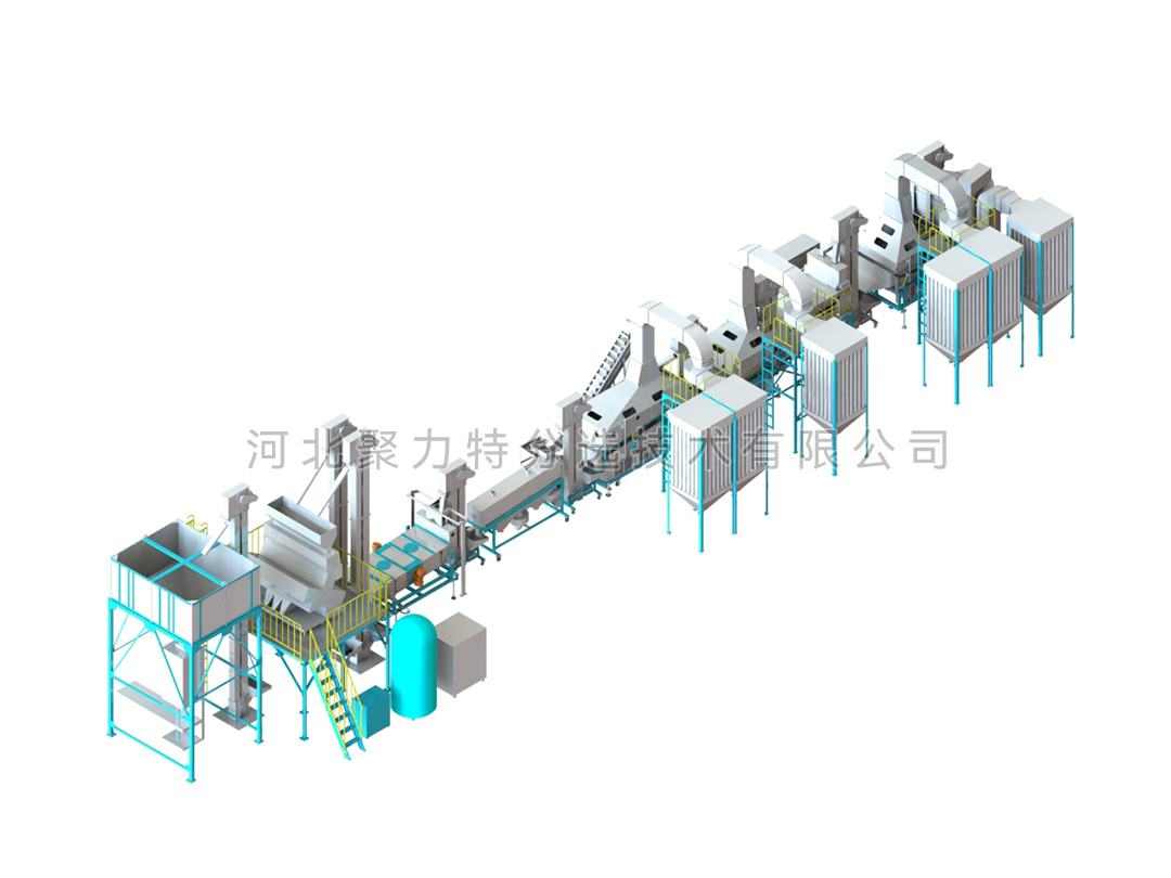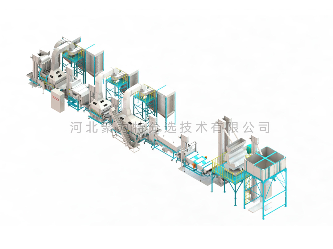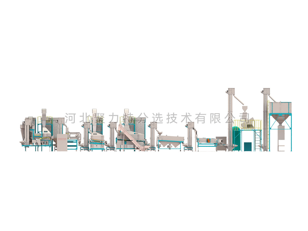 豆類清理生產線由風篩清選機、磁力選土機、比重去石機、比重精選機、拋光機、振動分級篩、定量包裝秤、脈沖除塵器、布袋除塵器、提升機和其他輔件組成。